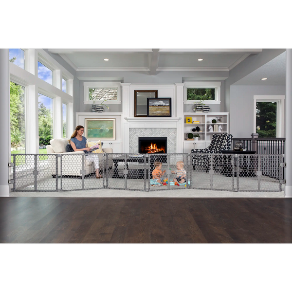 Made of high-quality plastic, the 6-panel gate expands up to 192” wide and is designed with plastic hinged posts to offer a variety of shaping possibilities. It is deal for large and angled openings or as a play yard for your child.