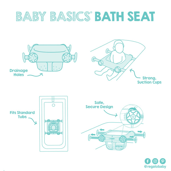 Designed to make bath time simple and safe, the Regalo® Baby Basics® Bath Seat keeps your baby seated and comfortable through all wiggly stages. Made with smooth corners, draining holes, and easy-to-clean material, the Bath Seat makes bath time easy on you and your baby. The perfect seat with lots of room to wash baby while baby enjoys bath time!