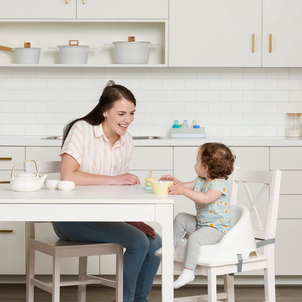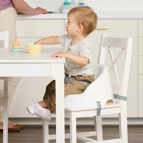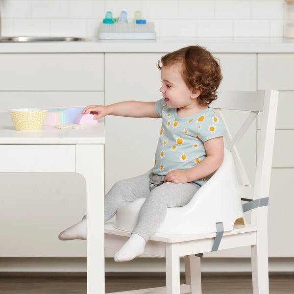 The sleek profile of the seat helps fit into a home’s décor and gives your child a little height boost to make mealtimes at the table easier. The seat is equipped with straps to connect the booster safely to a chair. It also features an easy-to-use, three-point safety harness to secure your child once they are in the booster seat.