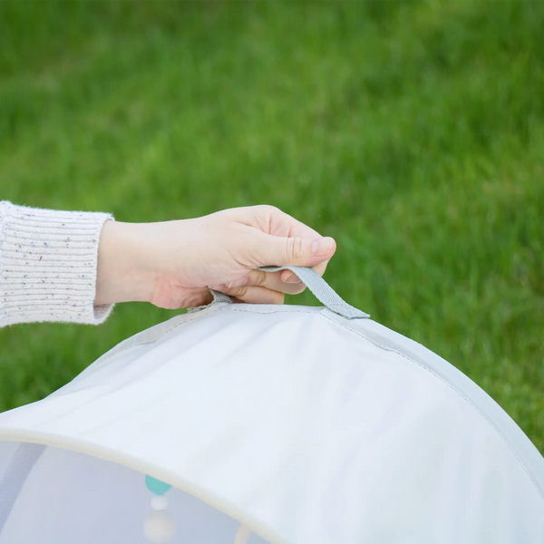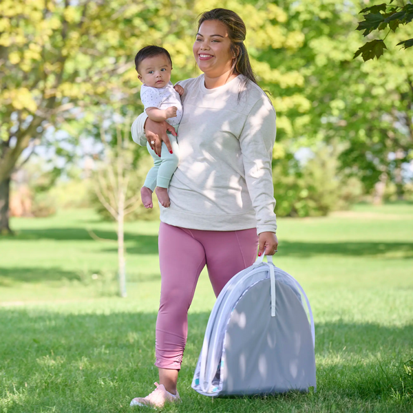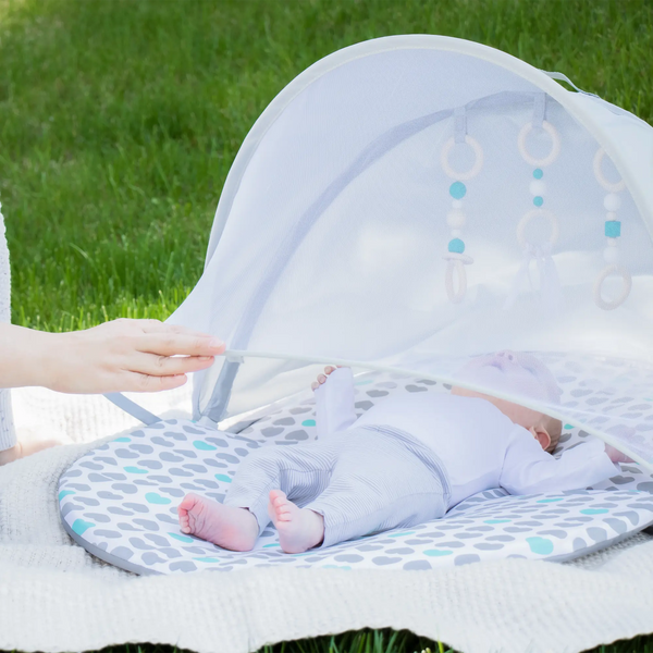 This space is ideal for lounging and only takes a minute to unfold and set up. This attractive infant play mat can be used indoors and outdoors, measuring 25” wide and 18” high. The UPF 50+ sunshade has a soft mesh bug net that pulls down on either side to create an enclosed space to keep your baby comfortable while outdoors.