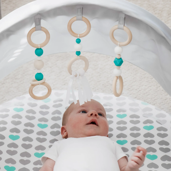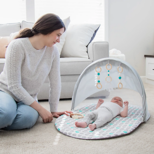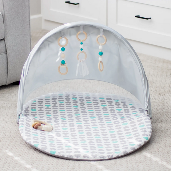 The soft pad provides extra comfort, while the three hanging toys provide stimulation. The infant play mat easily accommodates children up to 15lbs.