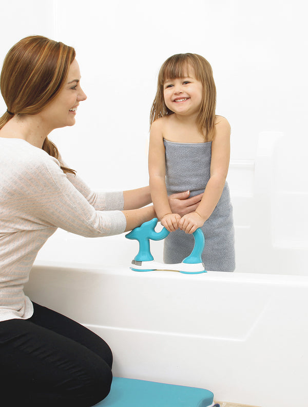 Helping your child get in and out of the tub safely is the goal of our Safety Hand Rail while avoiding bumps and bruises is the job of our Blue Whale Spout Cover. Our Bath Toy Scoop and Store keep toys organized and dry when storing, while the Bath Kneeler is to keep YOU comfortable while kneeling over the tub.
