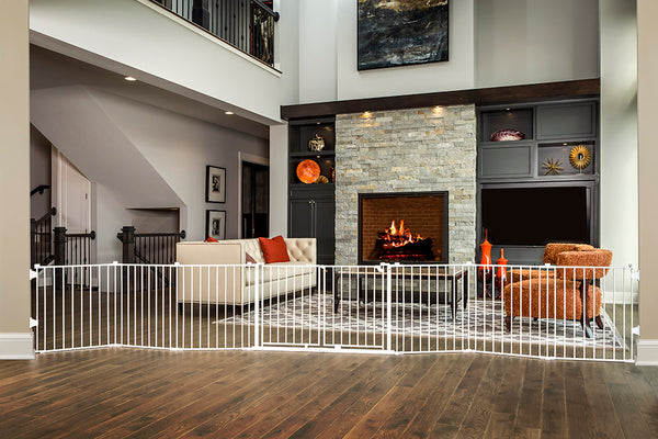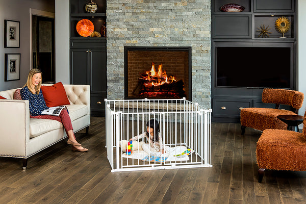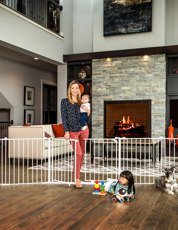 The Regalo® Double Door Super Wide™ Baby Gate and Play Yard offers numerous convenient configurations for around the house. This play yard and safety gate feature durable all-steel components and a hardware-mount system ideal for large, angled, or uneven openings. It features a double door allowing for a large walk-through space.