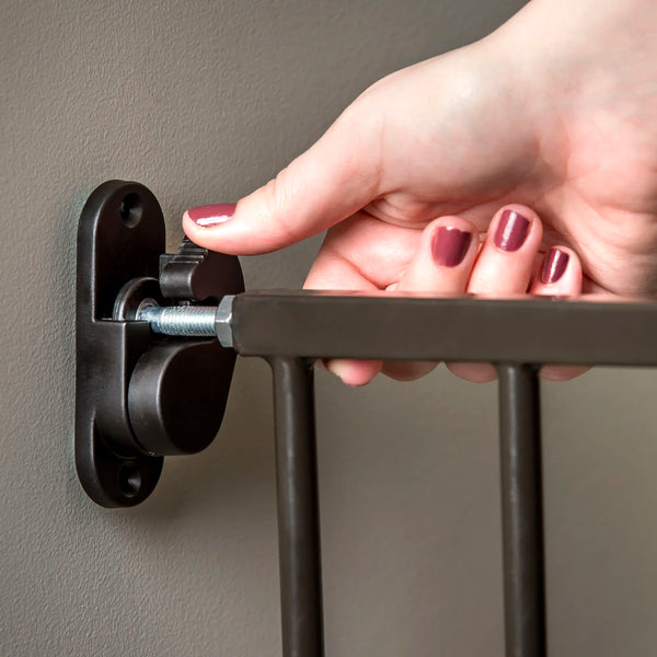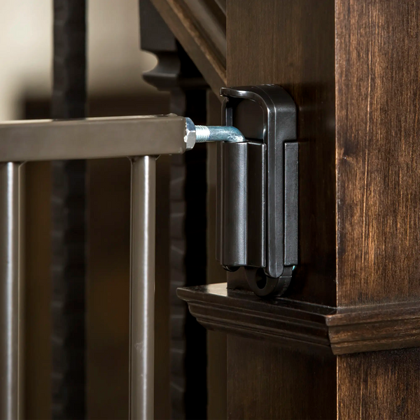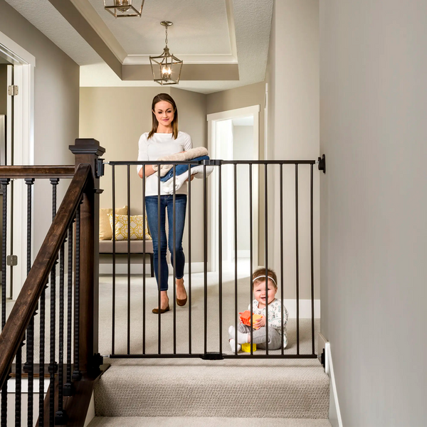 The Extra Tall Regalo Top of Stairs Baby Gate is a sturdy, convenient gate to protect your mobile child from the dangers of stairs. The hardware mounts are included to secure the gate to the wall or banister. Designed to be sleek and secure, the gate makes use of a hinge system to create a tight fit and easy walk-through.