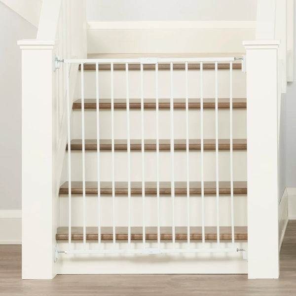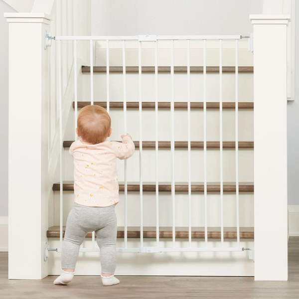 The Extra Tall Regalo Top of Stairs Baby Gate is a sturdy, convenient gate to protect your mobile child from the dangers of stairs. The hardware mounts are included to secure the gate to the wall or banister. Designed to be sleek and secure, the gate makes use of a hinge system to create a tight fit and easy walk-through.