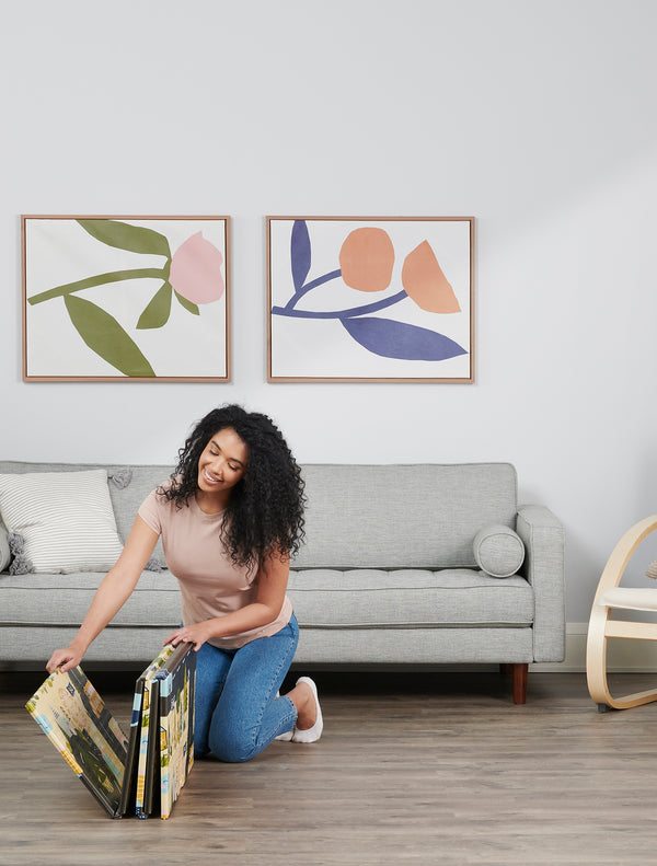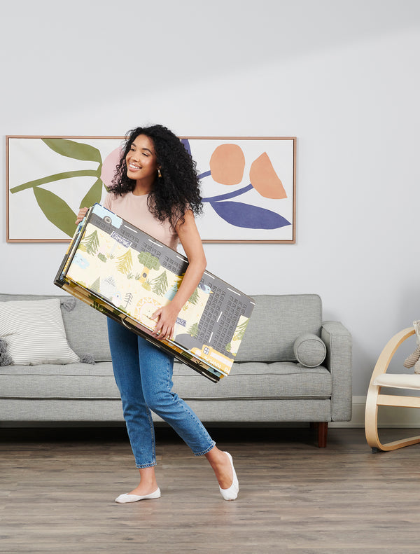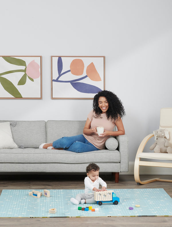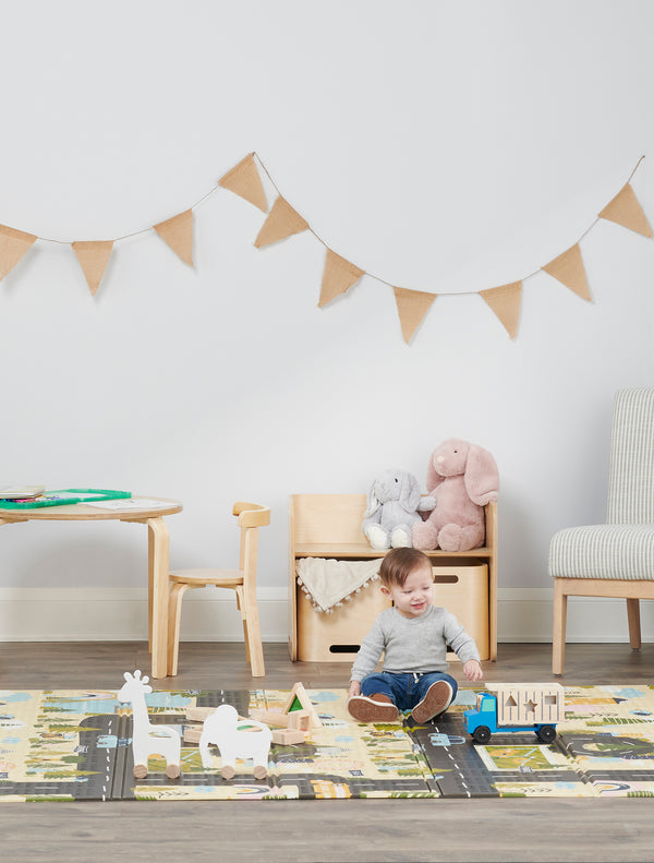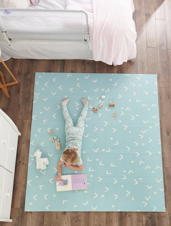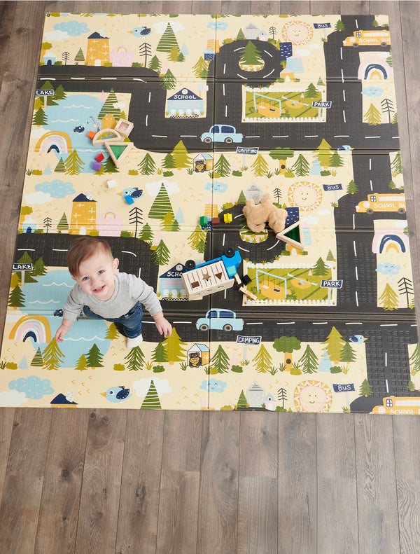 The Regalo® Around Town My Play Mat® is a lightweight, foldable, play mat ideal to protect those little hands and feet by covering hard surfaces. The play mat folds up in seconds for easy storage. The reversible play mat features an adorable town on one side and a blue geometric pattern on the opposite side. It is made with soft foam and is wipeable with a wet cloth.
