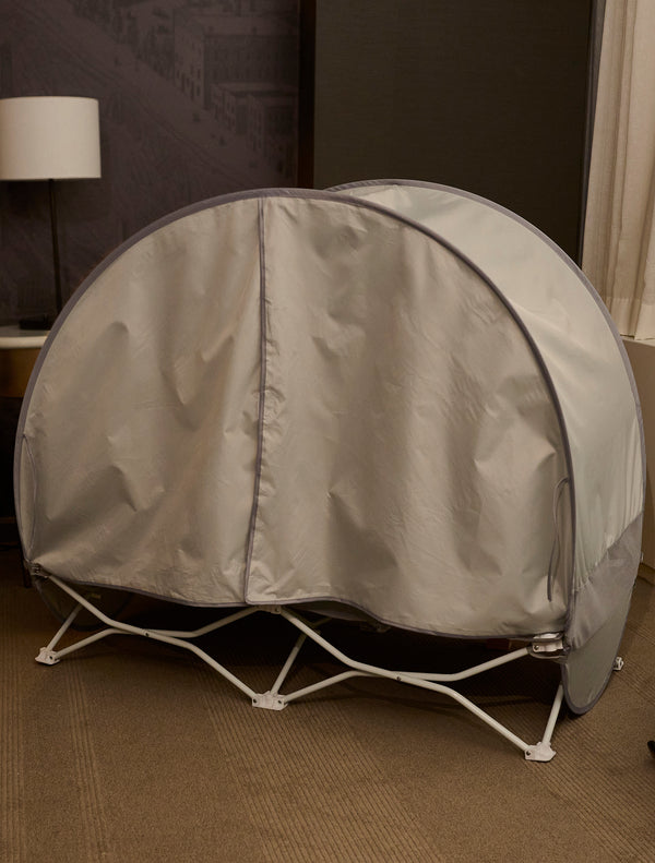 The UPF 50 canopy quickly pops open and snaps on to create a covered space to hang out. The compact canopy has two doors that can be shut or tied open.