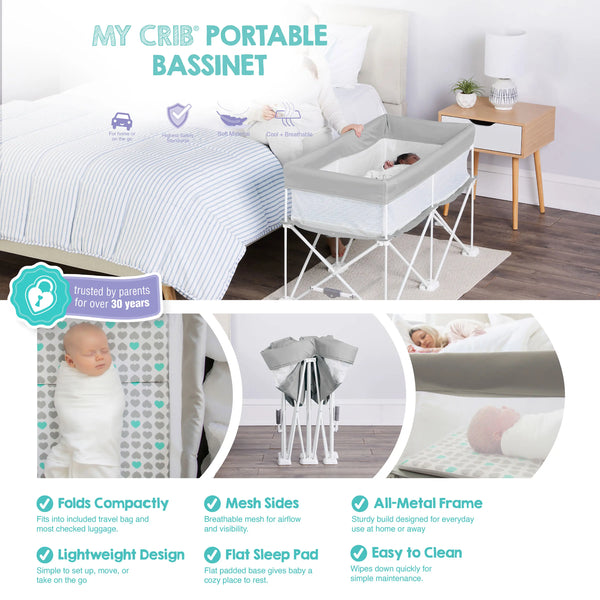 The Regalo® My Crib® Portable Bassinet gives the baby a comfortable spot to relax and sleep at home or on the go. This space-saving bassinet easily folds open to assemble whether you are at home, taking a vacation, or popping over to the grandparents. Unlike other bulky portable sleep systems, the foldable bassinet is very lightweight. The travel crib folds compactly to fit into an average size checked luggage bag.
