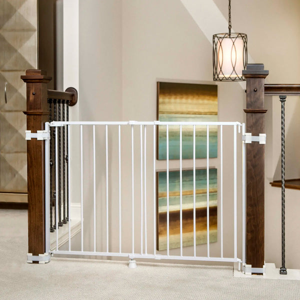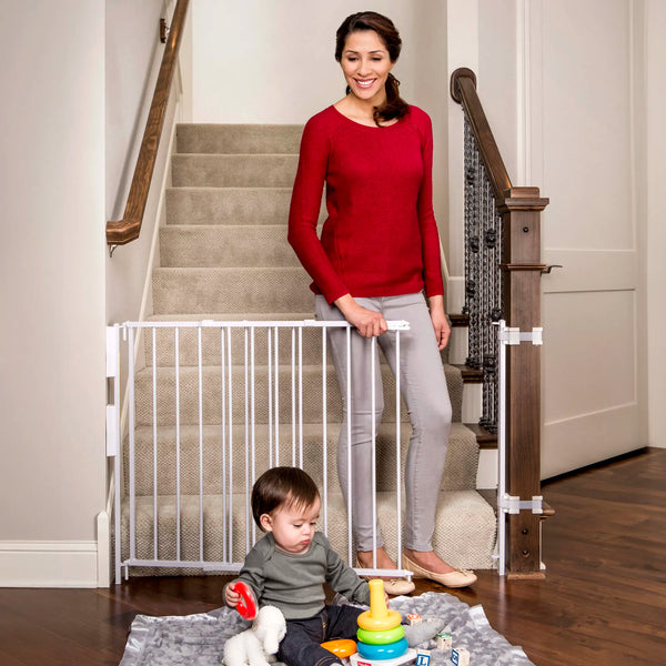 The Regalo Top of Stairs Baby Gate is a sturdy, convenient gate to protect your mobile child from the dangers of stairs. Offering a universal banister-mount kit, the gate fits 99% of stairway applications. It is ideal for both the top or bottom of stairs.