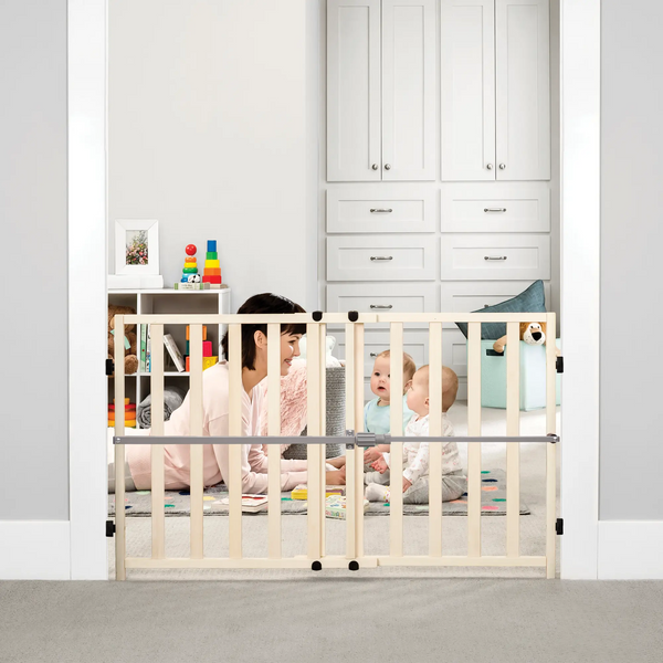 The Regalo® Wooden Expandable Baby Gate is a sleek, simple, and effective way to protect your baby and home. The gate is made of high-quality wood and is designed to easily step over. It has an easy twist and lock system for securing the gate into place. Perfect for easily moving from room to room!